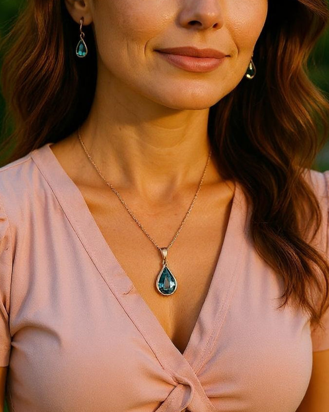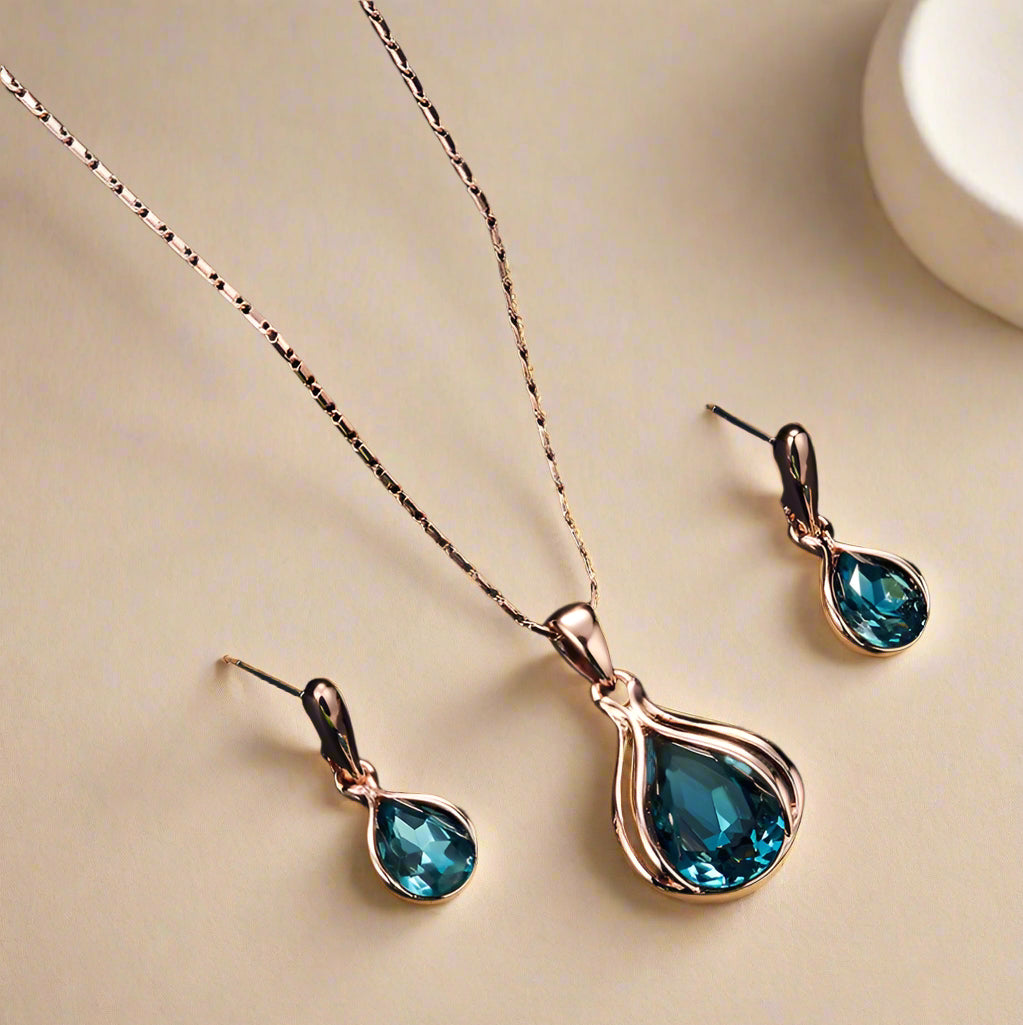 Et elegant smykkesæt med matchende halskæde og øreringe i dråbeform – perfekt til at tilføje raffineret glans til ethvert outfit.