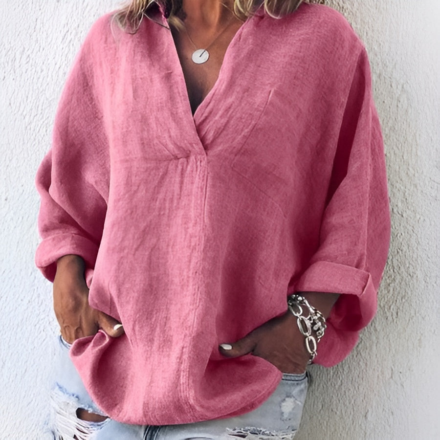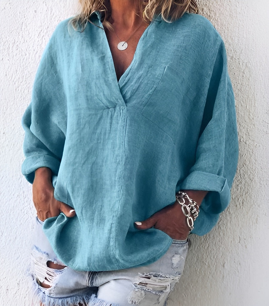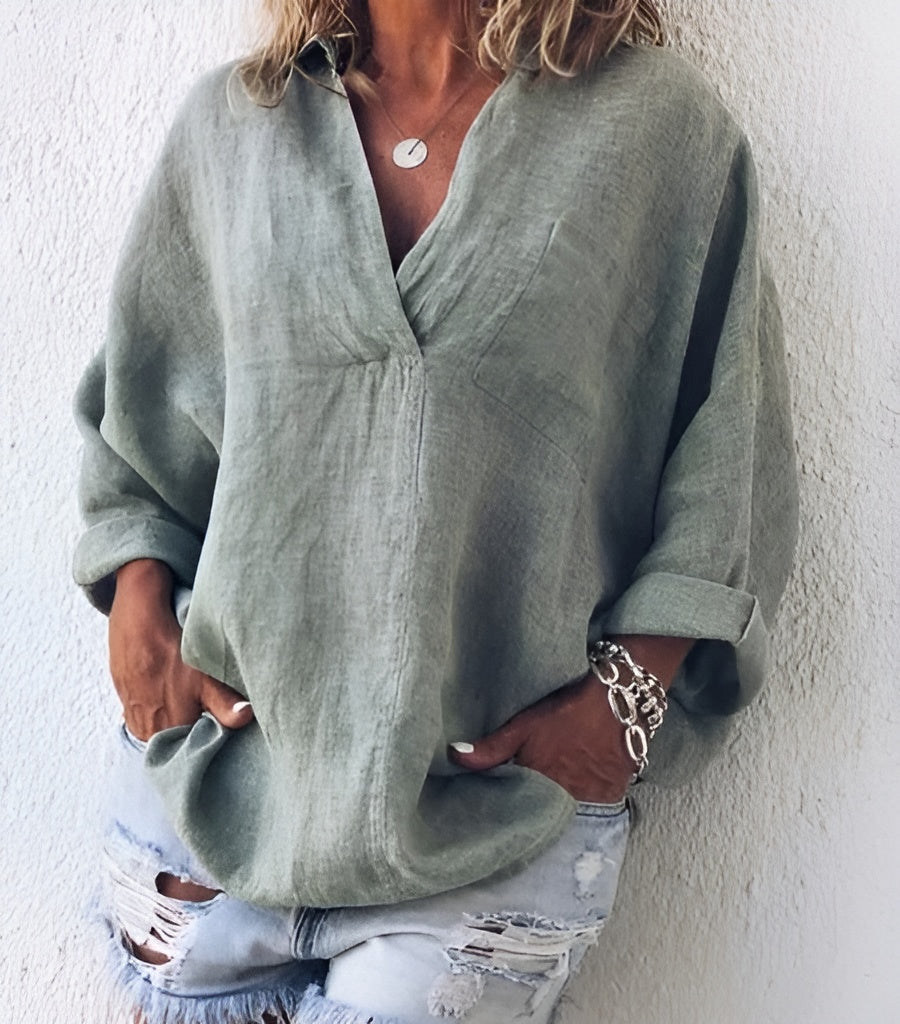 Freja™-toppen er lavet af en åndbar blanding af bomuld og hør, hvilket gør den blød og holder dig kølig på varme dage. Den løstsiddende pasform sikrer komfort og bevægelsesfrihed, mens det elegante design passer til forskellige lejligheder.