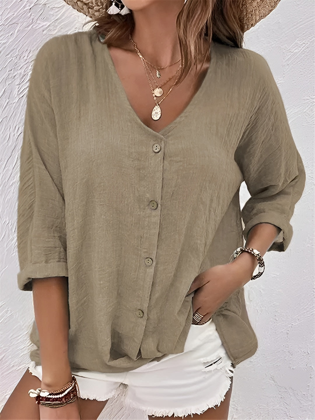 Sanne™-blusen er lavet af en åndbar blanding af hør og polyester, der holder dig kølig på varme dage. Den løstsiddende pasform og V-udskæring giver et flatterende look, der passer til alle kropstyper. Uanset om du skal på stranden, gå en tur eller til middag, er denne bluse din perfekte følgesvend.